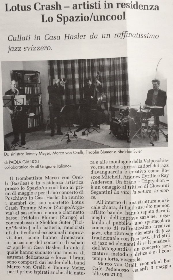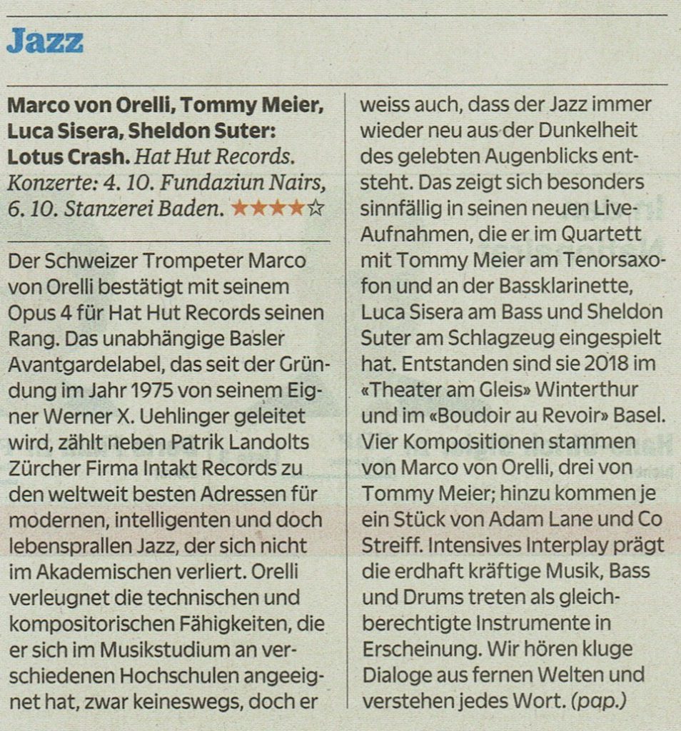 Marco von Orelli trat auch in unserem Land auf, Ende September 2021 beim Prague Free Jazz Festival mit Lotus Crash. Der Name der Band war ursprünglich der Titel des ausgezeichneten Albums, das der Tenorsaxophonist und Bassklarinettist Tommy Meier, der Kontrabassist Luca Sisera und der Schlagzeuger Sheldon Suter (mit Fridolin Blumer, der ihn in Prag vertrat) im Sommer 2018 mit Orelli aufgenommen haben.